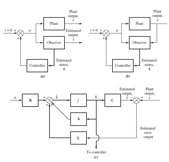 \[\begin{align} \dot{x}&=A\,x+B\,u \\ y&=C\,x \end{align}\] \[\begin{align} \dot{\hat{x}}&=A\,x+B\,u+L(y-\hat{y}) \\ \hat{y}&=C\,x \end{align}\]substrayendo las ecuaciones anteriores:
