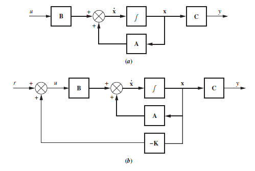 Diagrama de bloques de un sistema en lazo abierto y lazo cerrado, con realimentación de estados.