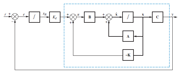 \[\begin{align} \begin{bmatrix} \dot{x}\\ \dot{x_N} \end{bmatrix}&= \begin{bmatrix} (A-BK) & B\,K_e \\ -C & 0 \end{bmatrix} \,\begin{bmatrix} x\\ x_N \end{bmatrix}+ \begin{bmatrix} 0\\ 1 \end{bmatrix} \,r \\ y&= \begin{bmatrix} C & 0 \end{bmatrix} \,\begin{bmatrix} \dot{x}\\ \dot{x_N} \end{bmatrix} \end{align}\]Ejercicios